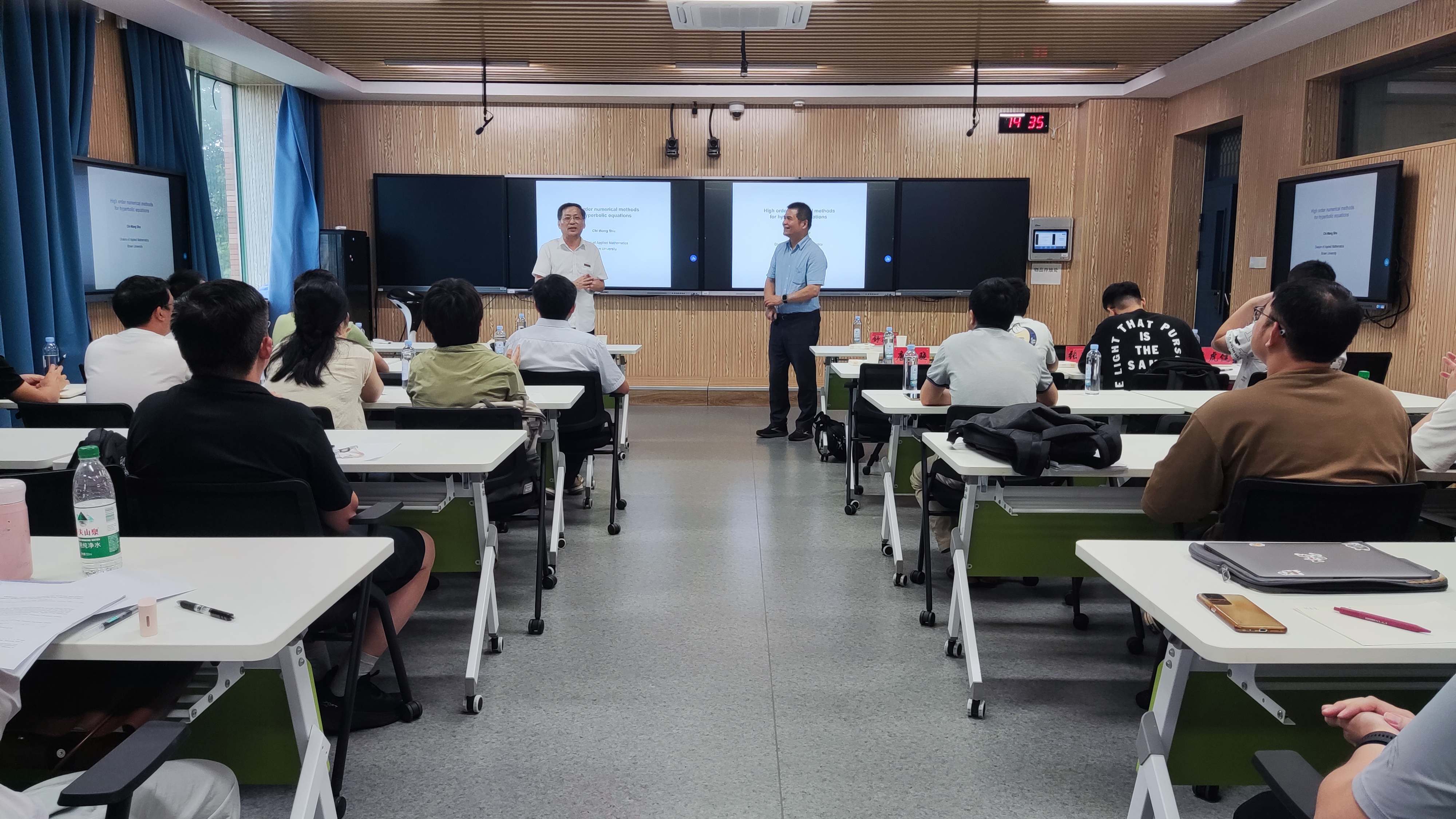 上午,张志豪博士作了题为《单层与多层浅水波方程组的高精度保平衡能量稳定自适应移动网格方法》的报告,该报告提出了一种自适应网格移动方法求解浅水波问题。紧接着,唐一骁博士作了题为《一种基于频率的p-自适应谱方法》的报告,该报告主要介绍谱方法中p-自适应技术在处理复杂问题和高频问题时显示出其优越性。最后,左虎健博士作了题为《双曲守恒律方程的新的SILW边界处理方法》的报告,该报告主要介绍了一维双曲守恒定律方程的线性稳定性问题。